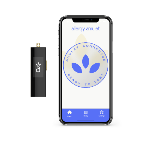 Collect a sample of your food, and within ~1 minute, the Amulet reports if your food allergen is present.